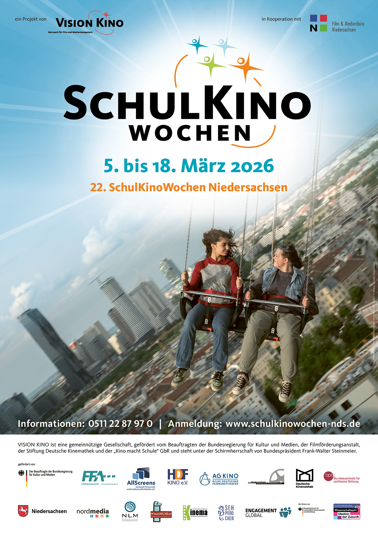 Die SchulKinoWochen Niedersachsen werden veranstaltet von VISION KINO – Netzwerk für Film und Medienkompetenz in Kooperation mit dem Film & Medienbüro Niedersachsen e.V. sowie weiteren Landespartnern. Unterstützt und gefördert werden sie vom Niedersächsischen Kultusministerium, der Niedersächsischen Landesmedienanstalt und der nordmedia – Film- und Mediengesellschaft Niedersachsen/Bremen mbH. VISION KINO ist eine gemeinnützige Gesellschaft zur Förderung der Film- und Medienkompetenz von Kindern und Jugendlichen. Sie wird unterstützt von der Beauftragten der Bundesregierung für Kultur und Medien, der Filmförderungsanstalt, der Stiftung Deutsche Kinemathek sowie der Kino macht Schule GbR, bestehend aus dem Verband der Filmverleiher e.V., dem HDF Kino e.V., der Arbeitsgemeinschaft Kino • Gilde deutscher Filmkunsttheater e.V. und dem Bundesverband kommunale Filmarbeit e.V. Die Schirmherrschaft über VISION KINO hat Bundespräsident Frank-Walter Steinmeier übernommen. werden.